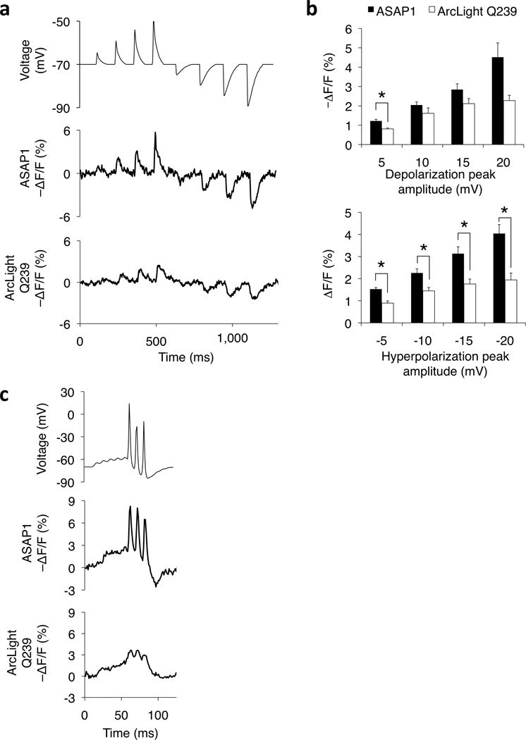 Figure 3. Monitoring simulated hyperpolarizations and subthreshold potentials in voltage-clamped neurons. (a) ASAP1 can detect subthreshold potential and hyperpolarization waveforms in cultured hippocampal neurons. Subthreshold depolarizations and hyperpolarizations have peak amplitudes of 5, 10, 15, and 20 mV, and peak full width at half maximum of 17 ms (depolarizations) and 38 ms (hyperpolarizations). (b) Quantification of the fluorescence responses to subthreshold depolarizations (top) and hyperpolarizations (bottom). Asterisks identify statistically significant differences from pairwise two-tailed t-tests adjusted for multiple comparisons using the Holm-Bonferroni method (p = 0.006, −5 mV waveform; p = 0.0005, 0.008, 0.007 and 0.003 for the −5, −10, −15 and −20mV waveforms, respectively). Multiple comparisons adjustments were performed separately for depolarizations and hyperpolarizations. n = 6 (ASAP1) and 4 (ArcLight Q239) neurons from the same litter. Error bars, SEM. (c) ASAP1’s faster kinetics allow improved resolution of a 100-Hz, three-AP waveform sequence in cultured hippocampal neurons (ASAP1, n = 8 neurons; ArcLight Q239, n = 6 neurons; all cells from same litter). Command voltage spike FWHM is 1.8 ms. Additional examples are in Supplementary Fig. 7.