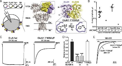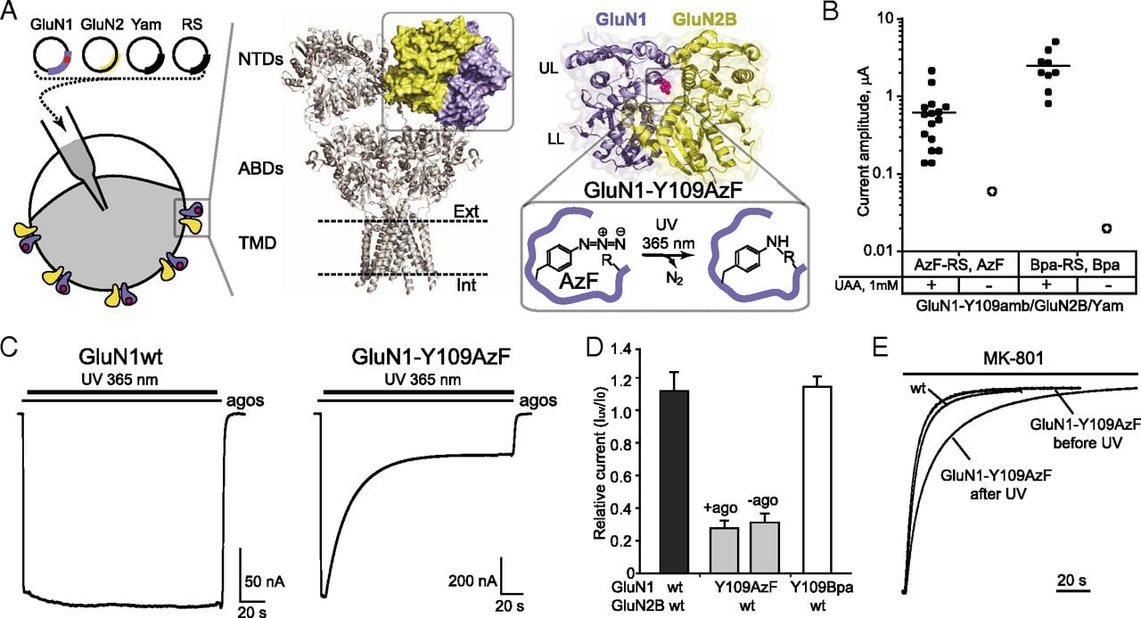 Fig. 1. Light inactivation of GluN1/GluN2B NMDARs incorporating a genetically encoded photoactive UAA. (A, Left) Four plasmids encoding the GluN1 subunit with an amber stop codon at position Y109 (red dot), the wt GluN2 subunit, the suppressor tRNA (Yam), and the engineered tRNA synthetase (RS) were coinjected into Xenopus oocytes. (Center) Crystal structure of the GluA2 AMPA receptor (40). The three major domains—N-terminal domain (NTD), agonist-binding domain (ABD) and transmembrane domain (TMD)—are arranged in layers. One NTD dimer is highlighted. (Right) Crystal structure of the NMDAR GluN1/GluN2B NTD heterodimer (16); the ifenprodil molecule is omitted for clarity. LL, lower lobe; UL, upper lobe. The GluN1-Y109 site is highlighted. On UV irradiation, the azide moiety generates a biradical, which subsequently can react with a nearby residue to form a covalent adduct. (B) Current amplitudes from oocytes injected with plasmids as indicated, in the absence or presence of UAAs. For each condition, 20 oocytes were tested. Only currents >10 nA were plotted. (C) Representative current traces showing UV-induced current inhibition of GluN1-Y109AzF/GluN2B receptors but not wt GluN1/GluN2B receptors. (D) UV-induced current modifications at wt GluN1/GluN2B (1.11 ± 0.13; n = 8), GluN1-Y109AzF/GluN2Bwt with (0.28 ± 0.05; n = 16) or without (0.31 ± 0.05; n = 5) agonist, and GluN1-Y109Bpa/GluN2Bwt (1.15 ± 0.06; n = 5) receptors. Error bars, SD. (E) MK-801 inhibition kinetics of wt GluN1/GluN2B and GluN1-Y109AzF/GluN2B receptors before and after UV treatment. |