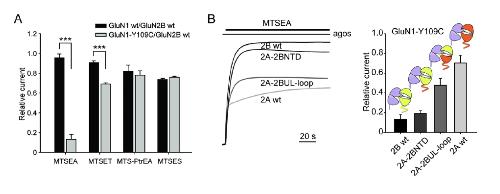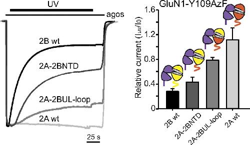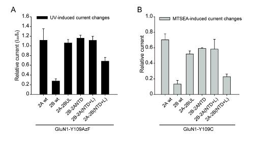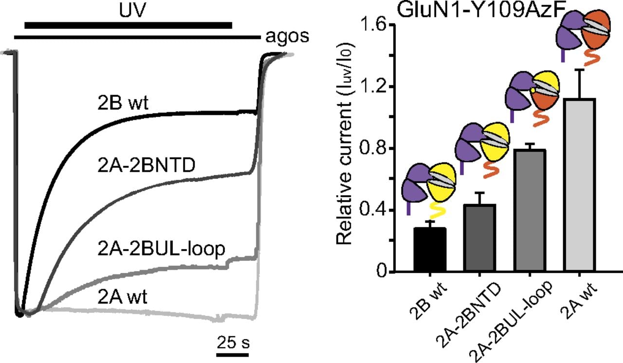 Fig. 2. UV-induced functional changes at the GluN1-Y109 position are GluN2 NTD-specific. (Left) Representative current traces of UV-induced effects on receptors incorporating GluN1-Y109AzF and wt GluN2B, GluN2A-2BNTD, GluN2A-2BUL-loop (the loop represents GluN2B-208MSLDDGD), or wt GluN2A. (Right) Relative currents (Iuv/I0) from receptors containing the GluN1-Y109AzF subunits and 2B (0.28 ± 0.05; n = 16), 2A-2BNTD (0.43 ± 0.08; n = 6), 2A-2BUL-loop (0.78 ± 0.04; n = 5), or 2A (1.10 ± 0.22; n = 5) subunit. Error bars, SD. |