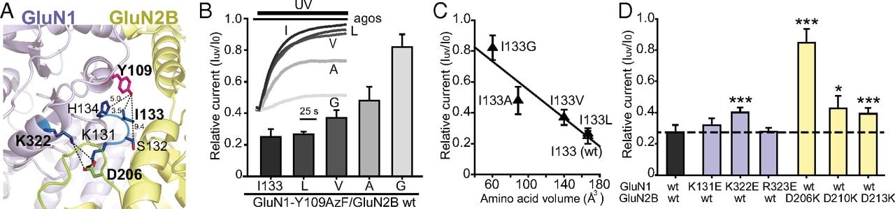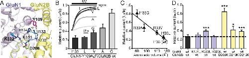 Fig. 4. Exploration of the photo–cross-linking site. (A) Local environment around the GluN1-Y109 site in the GluN1/GluN2B NTD dimer (16). The potential candidates on the GluN1-KSIH-loop for UV cross-linking are highlighted, and distances are indicated in Å. The interface residues GluN1-K322 and GluN2B-D206 are also highlighted. (B) Changes in current amplitude after UV illumination on GluN1-Y109AzF/GluN2B wt receptors or receptors incorporating an additional substitution (L, V, A, or G) at position GluN1-I133. Values are 0.28 ± 0.05, 0.28 ± 0.02, 0.37 ± 0.05, 0.48 ± 0.09, and 0.82 ± 0.08; n = 3–16. (Inset) Normalized current traces for GluN1-I133 and its substitutions. (C) The GluN1-133 residue volume and the UV-induced current reductions are strongly correlated (linear regression, R2 = 0.89). (D) Disruption of the UV effect by destabilizing the GluN1-UL/GluN2B-LL electrostatic contacts. Values are (from left to right): 0.28 ± 0.05, 0.32 ± 0.05, 0.40 ± 0.03, 0.28 ± 0.03, 0.85 ± 0.09, 0.43 ± 0.08, and 0.40 ± 0.04. n = 4–16. *P < 0.05, ***P < 0.001, Student t test. Error bars, SD. |