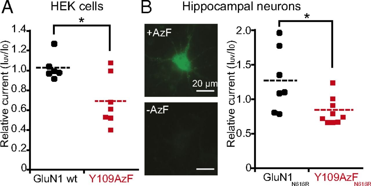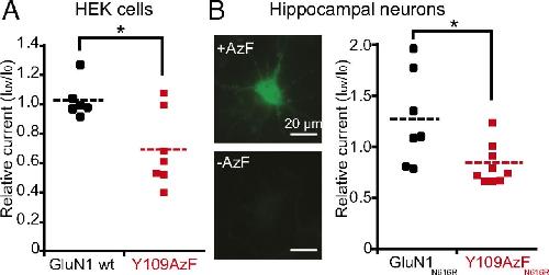 Fig. 5. Expression of UV-sensitive GluN1-Y109AzF NMDARs in mammalian cells. (A) UV-induced current modifications at GluN1 wt/GFP-Y182AzF-GluN2B (1.03 ± 0.12, n = 6) or GluN1-Y109AzF/GFP-Y182AzF-GluN2B (0.69 ± 0.25, n = 7) receptors expressed in HEK cells. (B, Right) UV-induced current modifications at GluN1-N616R/GFP-Y182AzF-GluN2B (1.27 ± 0.45, n = 7) or GluN1-Y109AzF-N616R/GFP-Y182AzF-GluN2B (0.84 ± 0.19, n = 9) receptors expressed in culture hippocampal neurons. (Left) Fluorescence images of neurons transfected with three plasmids encoding GluN1-Y109amb-N616R, GFP-Y182amb-GluN2B, and the suppressor tRNA/AzFRS pair (SI Appendix, Fig. S10A) with (Upper) or without (Lower) AzF in the medium. *P < 0.05, Student t test. |