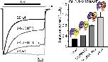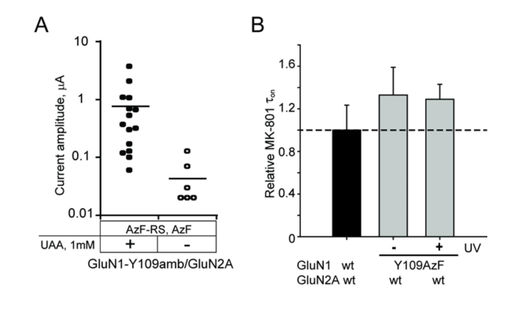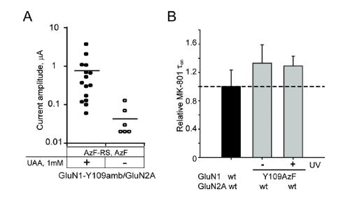 Fig. S3. Genetically encoding AzF in GluN1/GluN2A receptors (A) Representative dot plot of the current amplitudes from oocytes injected with plasmids encoding GluN1- Y109amb (40 ng/μl), GluN2A-wt (40 ng/μl), Yam suppressor tRNA (5 ng/μl), and AzF-RS (1ng/μl) in the absence (empty circles) or presence (solid circles) of the UAA in the incubation media. For each condition, 20 oocytes were tested. Only currents >10 nA were plotted. (B) Relative inhibition kinetics by 10 nM MK-801 applied to oocytes expressing wild-type (wt) GluN1/GluN2A receptors (1.00 ± 0.24), GluN1-Y109AzF/GluN2A before (1.33 ± 0.26) and after (1.29 ± 0.14) UV treatment. n=3 for each group. Error bars represent the S.D. |
