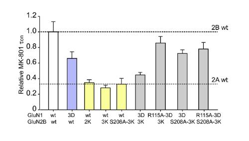 Fig. S8. Electrostatic interactions at the GluN1-UL/GluN2B-LL NTD dimer interface. Relative MK-801 inhibition kinetics of receptors incorporating wild-type (wt) or mutant GluN1, and wt or mutant GluN2B subunits. Values from left to right are: GluN1 wt/GluN2B wt (1.00 ± 0.13; n=35), GluN1-3D/GluN2B wt (0.66 ± 0.09; n=8), GluN1wt/GluN2B-2K (referring to D206K-D210K; 0.35 ± 0.04; n=8), GluN1 wt/GluN2B-3K (0.28 ± 0.04; n=9), GluN1 wt/GluN2B-S208A-3K (0.33 ± 0.07; n=6), GluN1-3D/GluN2B-3K (0.45 ± 0.03; n=4), GluN1-R115A-3D/GluN2B-3K (0.85 ± 0.08; n=8), GluN1-3D/GluN2B-S208A-3K (0.72 ± 0.05; n=2), GluN1-R115A3D/GluN2B-S208A-3K (0.78 ± 0.08; n=6). Error bars represent the S.D. |