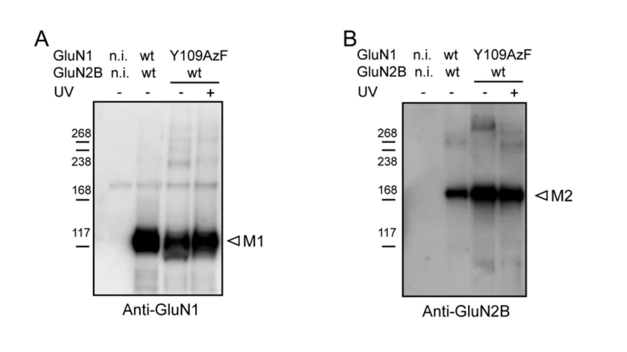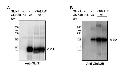 Fig. S9. No heterodimer formation after UV-treatment of GluN1-Y109AzF/GluN2B receptors. Western blots from Xenopus oocytes expressing wild-type (wt) GluN1/GluN2B or GluN1-Y109AzF/GluN2B receptors probed either with anti-GluN1 (left) or anti-GluN2B (right) antibodies. GluN1 monomers (M1, ~110 kDa) or GluN2B monomers (M2, ~180 kDa) are indicated with arrowheads. The - and + signs refer to the absence or presence, respectively, of UV irradiation (365 nm, 30 min). n.i. indicates non-injected oocytes. |