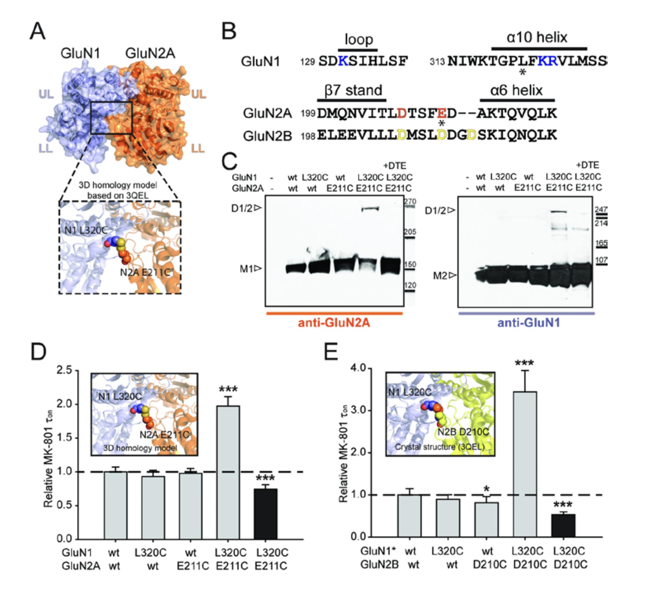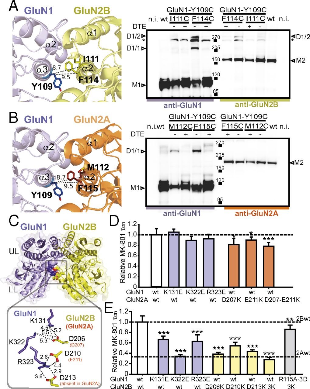 Fig. 3. Structural basis for the differential GluN1/GluN2 NTD dimer interfaces. (A and B, Left) View of the UL/UL interface in the GluN1/GluN2B NTD dimer crystal structure (A) (16) or GluN1/GluN2A NTD dimer model (B). Residues mutated into cysteines are represented in sticks with Cα-Cα distances indicated in Å. (Right) Immunoblots from Xenopus oocytes expressing either wt or mutant subunits. M1 indicates the GluN1 monomer (∼110 kDa); M2 the GluN2A or GluN2B monomer (∼180 kDa); D1/1 the GluN1 homodimer (∼220 kDa); and D1/2 the GluN1/GluN2 heterodimer (∼290 kDa). Treatment with (+) or without (−) DTE is also shown. *, a nonspecific band; n.i., noninjected oocytes. (C) Electrostatic interactions at the GluN1-UL/GluN2-LL interface as observed in the GluN1/GluN2B NTD dimer crystal structure (distances indicated in Å). (D and E) Relative MK-801 inhibition kinetics of receptors incorporating wt or mutant GluN1 and GluN2 subunits. Values are (from left to right) in D, 1.00 ± 0.11, 1.05 ± 0.06, 0.90 ± 0.07, 0.92 ± 0.09, 0.81 ± 0.12, 0.90 ± 0.06, and 0.79 ± 0.07; in E, 1.00 ± 0.13, 0.66 ± 0.07, 0.34 ± 0.03, 0.63 ± 0.12; 0.38 ± 0.03, 0.54 ± 0.07, 0.43 ± 0.03, 0.28 ± 0.04, and 0.85 ± 0.08. n = 4–35. *P < 0.05, **P < 0.01, ***P < 0.001, Student t test. Error bars, SD. |