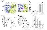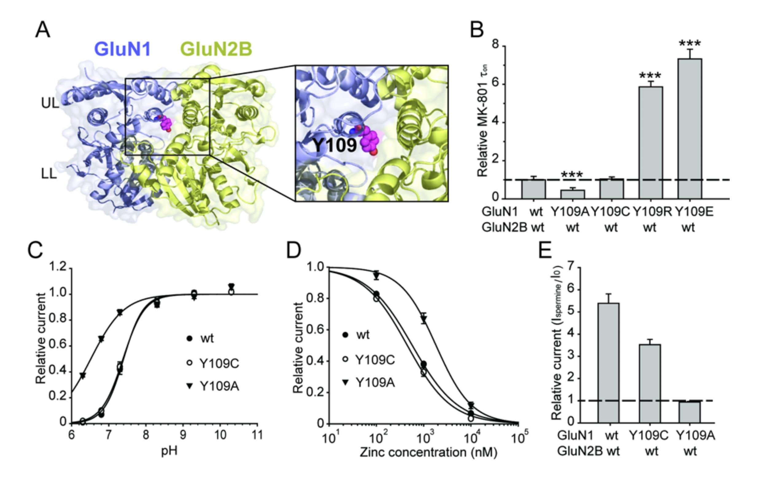 Fig. S1. GluN1-Y109 mutants alter both receptor channel activity and pharmacology. (A) X-ray crystal structure of the GluN1/GluN2B NTD dimer (pdb code: 3QEL; ref. (11)). The GluN1 subunit is colored in light blue, and GluN2B subunit in yellow. Zoom up view of the UL/UL interface. Residue GluN1-Y109 is highlighted in purple spheres. (B) Relative inhibition kinetics by 50 nM MK-801 of receptors incorporating wildtype (wt) GluN2B subunits and GluN1 wt (1.0 ± 0.1, n=19), GluN1-Y109A (0.44 ± 0.06, n=6), GluN1-Y109C (1.04 ± 0.11, n=3), GluN1-Y109R (5.87 ± 0.29, n=3), GluN1-Y109E (7.33 ± 0.51, n=4). ***P<0.001, Student’s t-test. (C) Proton sensitivity of GluN2B receptors containing wild-type or mutant GluN1 subunits. Values of pHIC50 and nH are: 7.40 ± 0.03 and 1.6 for GluN1 wt (n=3), 7.38 ± 0.02 and 1.5 for GluN1-Y109C (n=2), 6.52 ± 0.06 and 1.0 for GluN1-Y109A (n=3). (D) Zinc dose-response curves of GluN2B receptors incorporating wild-type or mutant GluN1 subunits. IC50 (nM) and nH are: 576 and 0.9 for GluN1 wt, 452 and 0.9 for GluN1-Y109C, 1829 and 1.2 for GluN1- Y109A. Maximum inhibition was fixed as 1. n=3-4 for each group. (E) 100 µM spermine potentiation of GluN2B receptors incorporating wild-type or mutant GluN1 subunits (experiments done at extracellular pH 6.6). Values of current potentiation are: 5.38 ± 0.42 for GluN1wt, 3.53 ± 0.24 for GluN1-Y109C, 0.94 ± 0.03 for GluN1-Y109A. n=3 for each group. Error bars represent the S.D. |