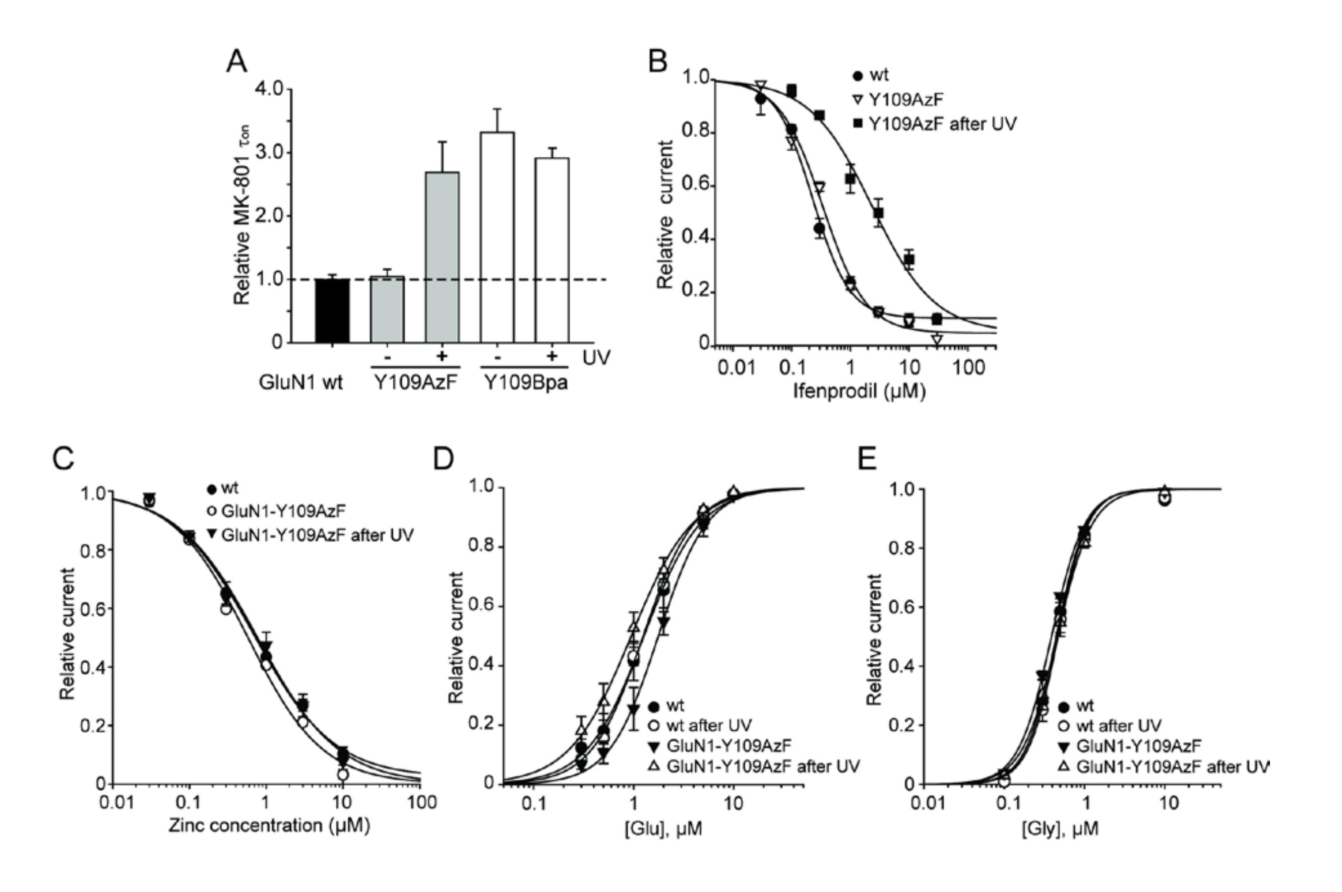 Fig. S2. Effect of UV treatment on the gating and pharmacological properties of GluN1-Y109AzF or GluN1-Y109Bpa incorporated receptors. (A) Relative MK-801 inhibition kinetics from oocytes expressing either wt GluN1/GluN2B receptors (1.00 ± 0.07; n=7), GluN1-Y109AzF/GluN2B receptors before (1.05 ± 0.11; n=7) and after (2.69 ± 0.48; n=9) UV treatment, or GluN1-Y109Bpa/GluN2B receptors before (3.32 ± 0.37; n=6) and after (2.91 ± 0.16; n=4) UV treatment. Error bars, S.D. (B) Ifenprodil sensitivity of wt GluN1/GluN2B receptors and GluN1-Y109AzF/GluN2B receptors before and after UV treatment. IC50 (µM), Hill coefficients (nH), maximal inhibition values are, respectively: 0.23 ± 0.02, 1.38, 0.90 for wt GluN1/GluN2B receptors; 0.34 ± 0.04, 1.18, 0.95 for GluN1-Y109AzF/GluN2B before UV, and 2.35 ± 0.34, 0.81, 0.95 after UV. n=3-4 for each group. (C) Zinc dose-response curves for wt GluN1/GluN2B receptors (IC50 = 0.68 μM, nH = 0.83, and Inhibitionmax = 0.98), GluN1-Y109AzF/GluN2B wt receptors before (IC50 = 0.58 μM, nH = 0.89, and Inhibitionmax = 1.00) and after (IC50 = 0.77 μM, nH = 0.82, and Inhibitionmax = 0.98) UV treatment. n=3-4 for each group. (D) Glutamate dose-response curves for wt GluN1/GluN2B receptors before (EC50 =1.27 μM, nH =1.52) and after UV (EC50 = 1.24 μM, nH = 1.69); for GluN1-Y109AzF/GluN2B wt receptors before (EC50 = 1.77 μM, nH = 1.78) and after (EC50 = 0.96 μM, nH = 1.40) UV treatment. n=3 for each group. (E) Glycine dose-response curves for wt GluN1/GluN2B receptors before (EC50 = 0.44 μM, nH = 2.3) and after UV (EC50 = 0.47 μM, nH = 2.3); for the GluN1-Y109AzF/GluN2B wt receptors before (EC50 = 0.39 μM, nH = 2.1) and after (EC50 = 0.46 μM, nH = 2.00) UV treatment. n = 3-4 for each group. Error bars, S.D |