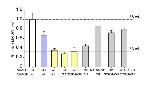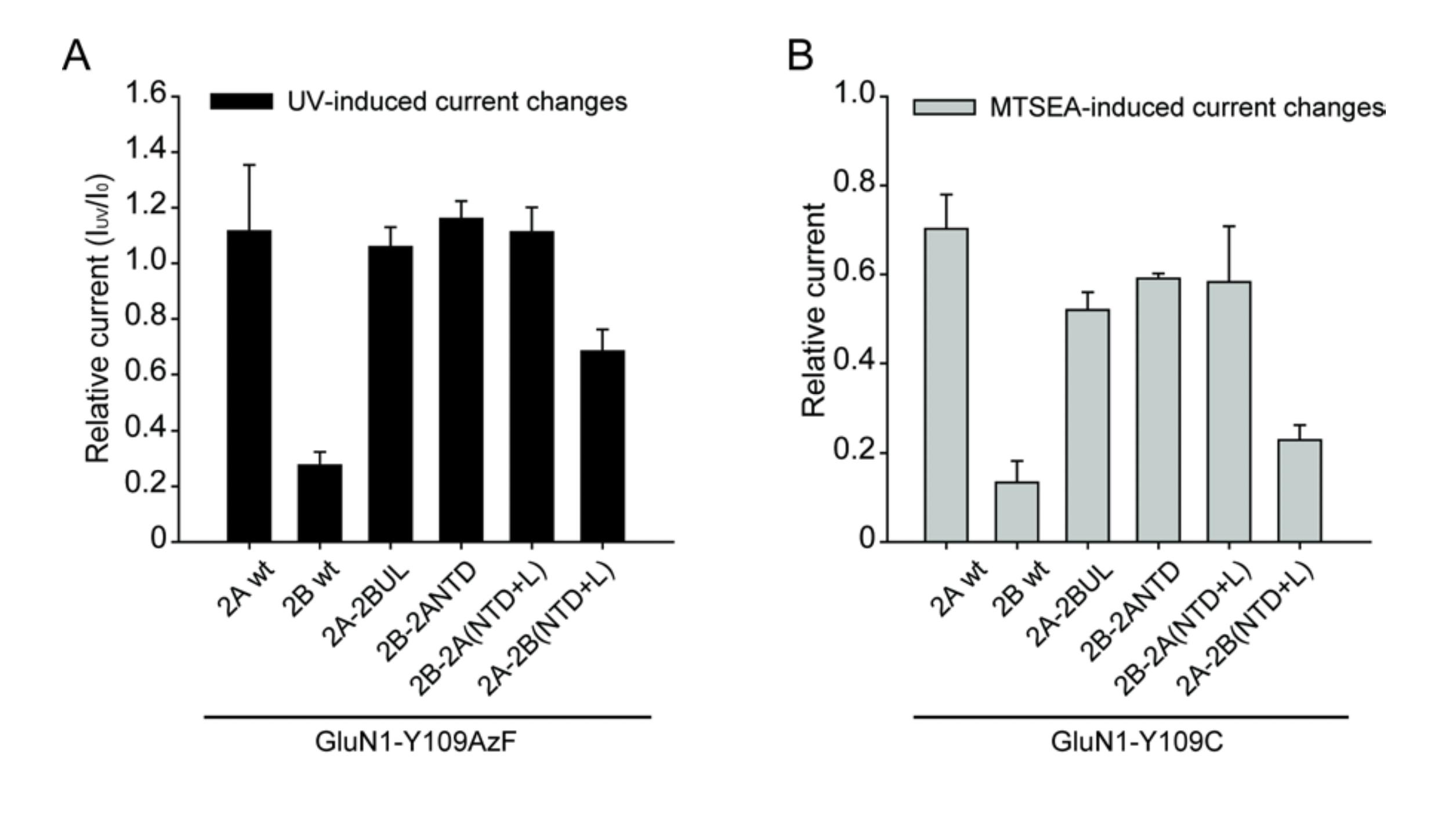 Fig. S4. Modulating UV- and chemical-induced receptor alterations by GluN2A and GluN2B NTD chimeras (A) UV modification of current carried by receptors containing GluN1-Y109AzF subunits and GluN2A wt (1.12 ± 0.24), GluN2B (0.28 ± 0.05), GluN2A-2BUL (1.06 ± 0.07), GluN2B-2ANTD (1.16 ± 0.06), GluN2B-2A(NTD+L) (1.11 ± 0.09) or GluN2A-2B(NTD+L) (0.68 ± 0.08). n=3-16 for each group. (B) MTSEA modification at GluN1- Y109C receptors containing various GluN2 subunits. Values are: GluN2A wt (0.70 ± 0.08), GluN2B wt (0.13 ± 0.05), GluN2A-2BUL (0.52 ± 0.04), GluN2B-2ANTD (0.59 ± 0.01), GluN2B-2A(NTD+L) (0.58 ± 0.13), GluN2A2B(NTD+L) (0.23 ± 0.03). n = 3-12 for each group. Error bars represent the S.D. |
