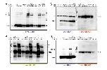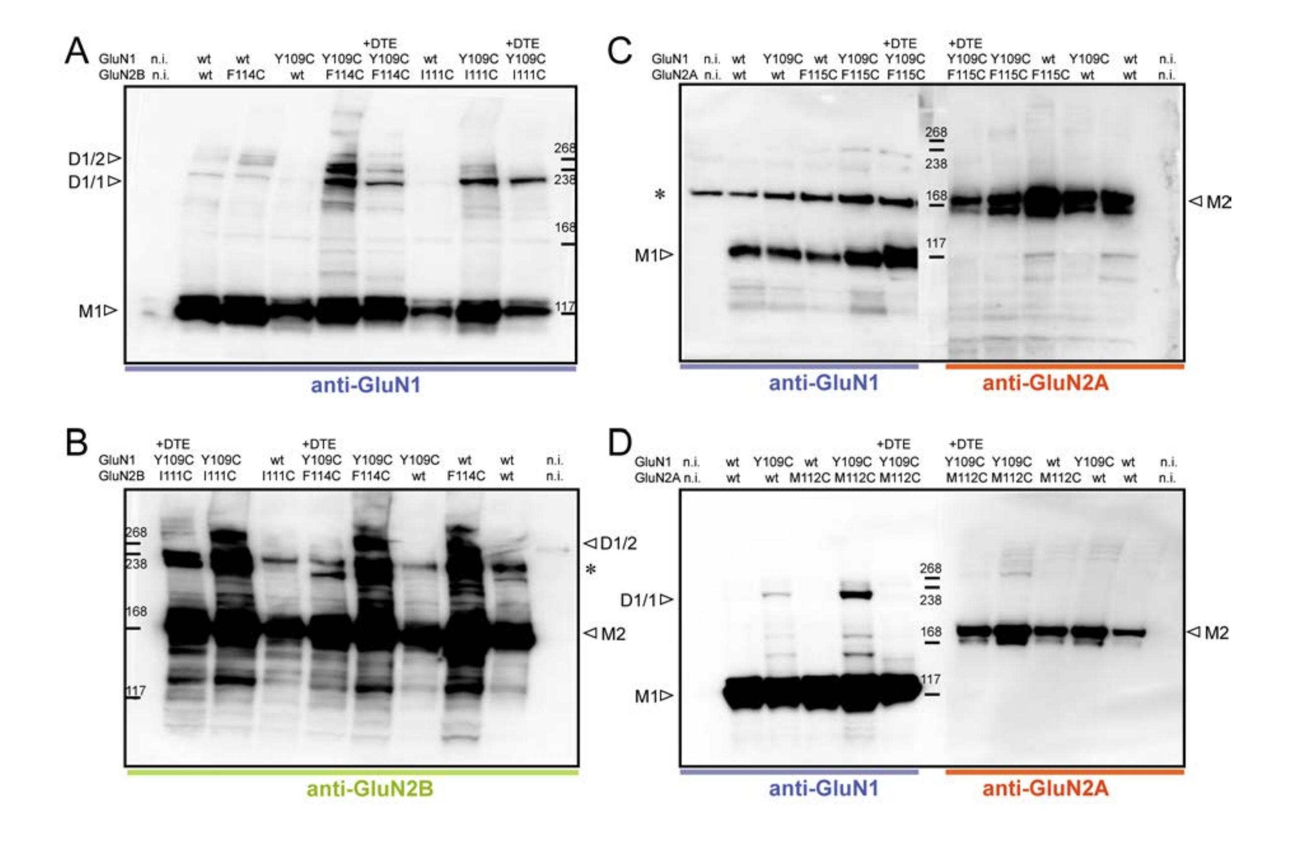 Fig. S6. Differential NTD UL/UL interface in GluN2A- and GluN2B- containing receptors. (A,B) Immunoblots from Xenopus oocytes expressing either wt or mutant GluN1 and GluN2B subunits detected by anti-GluN1 (blue) or anti-GluN2B (yellow) antibodies. M1 indicates the expected band location of the GluN1 monomer (~110 kDa); M2 indicates the expected band location of the GluN2B monomer (~180 kDa); D1/2 indicates the expected band location of the GluN1/GluN2B heterodimer (~290 kDa); D1/1 indicates the expected band location of the GluN1 homodimer (~220 kDa). * indicates a non-specific band. n.i. indicates non-injected oocytes. Treatment with the reducing reagent DTE is also marked (+DTE). (C,D) Immunoblots from Xenopus oocytes expressing either wild-type (wt) or mutant GluN1 and wt or mutant GluN2A subunits detected by antiGluN1 (blue) or anti-GluN2A (orange) antibodies. M1 indicates the expected band location of the GluN1 monomer (~110 kDa); M2 indicates the expected band location of the GluN2A monomer (~180 kDa); D1/1 indicates the expected band location of the GluN1 homodimer (~220 kDa). The anti-GluN1 antibodies MAB363 and MAB1586 were used in (A,C) and (D), respectively. |