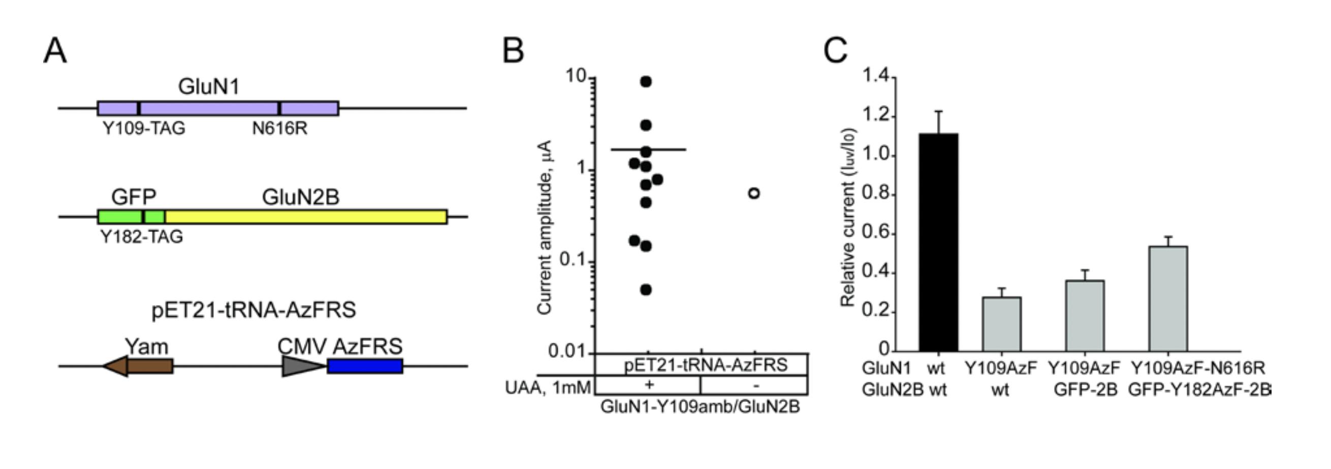 Fig. S10. Optimization and validation in Xenopus oocytes of molecular biology constructs for expression of AzF containing NMDARs in mammalian cells (A) Plasmid constructions designed for mammalian cell transfections. One plasmid encodes the GluN1 subunit with the Y109 site mutated to the amber stop codon and the N616 at the Q/R/N pore site mutated to R in order to confer resistance to extracellular Mg2+ block. Another plasmid encodes the GFP fused to the N-terminal of the GluN2B subunit. The amber stop codon was inserted at the Y182 position of the GPF, in order to use green GFP fluorescence as a reporter of AzF incorporation. One bidirectional plasmid named pET21-tRNA-AzFRS encodes the suppressor tRNA Yam driven by its internal promoter and the AzFRS driven by the CMV promoter. (B) Current amplitudes from oocytes co-injected with GluN1-Y109amb, wild-type (wt) GluN2B and pET21-tRNAAzFRS plasmids, incubated in the absence (n=9) or presence (n=15) of the UAA AzF. Only currents >10 nA were plotted. (C) UV-induced current modifications at GluN1 wt/GluN2B wt (1.11 ± 0.13; n=8), GluN1-Y109AzF/GluN2B wt (0.28 ± 0.05; n=16), GluN1-Y109AzF/GFP-GluN2B (0.31 ± 0.03; n=5), and GluN1-Y109AzF-N616R/GFPY182AzF-GluN2B receptors (0.54 ± 0.05; n=5). Error bars represent the S.D. |