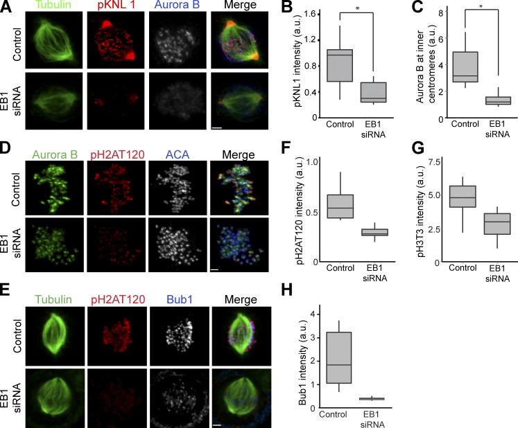 The Aurora B kinase coordinates kinetochore-microtubule attachments with spindle checkpoint signaling on each mitotic chromosome. We find that EB1, a microtubule plus end-tracking protein, is required to enrich Aurora B at inner centromeres in a microtubule-dependent manner. This regulates phosphorylation of both kinetochore and chromatin substrates. EB1 regulates the histone phosphorylation marks (histone H2A phospho-Thr120 and histone H3 phospho-Thr3) that localize Aurora B. The chromosomal passenger complex containing Aurora B can be found on a subset of spindle microtubules that exist near prometaphase kinetochores, known as preformed K-fibers (kinetochore fibers). Our data suggest that EB1 enables the spindle microtubules to regulate the phosphorylation of kinetochores through recruitment of the Aurora B kinase.