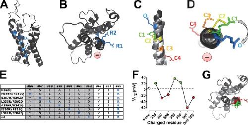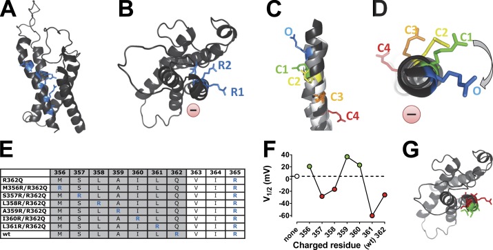 Figure 1. Charge distribution and voltage dependence of opening of WT and mutated Shaker K channels. (A and B) Gating charges R1–R4 in S4 denoted as blue sticks in a VSD structure (side view [A] and top view [B]) of an open K channel (the Kv1.2/2.1 chimera structure with Shaker side chains; Long et al., 2007; Henrion et al., 2012). The approximate interaction site for DHA is marked with the red encircled negative sign in B (Börjesson and Elinder, 2011). (C and D) R1 (R362) is highlighted in five superimposed structures of S4 (side view [C] from residue 356 and top view [D] from residue 361), for four closed (C1–C4) and one open (O) model states (Henrion et al., 2012). Backbones are color coded according to opening level, from light gray (C4) to black (O). In D, the approximate interaction site for DHA is marked with the red encircled negative sign (Börjesson and Elinder, 2011). The arrow in D denotes the movement of R1 when S4 moves from C1 to O, the step most sensitive to DHA (Börjesson and Elinder, 2011). (E) Amino acid sequences of the extracellular end of S4 (Shaker channel) from the eight single-residue mutations investigated. The positively charged arginines (R) are marked in blue. The mutated region is shown in gray. R1 = R362. (F) The voltage required to reach 50% of the maximum conductance (V1/2) plotted against the residue number of the positive charge. The dotted line corresponds to V1/2 for the channel without charges in the studied region (R362Q). Green symbols denote positive midpoint voltages relative the neutral 356–362 segment (open symbol), and the red symbols denote negative midpoint voltages. (G) Residues 356–362 are denoted as sticks on the open Shaker VSD structure with same color coding as in F.