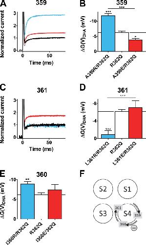 Figure 3. Charge-dependent DHA sensitivity. (A) Normalized representative current traces for voltages corresponding to 10% of Gmax in control solution at pH 7.4. Black and gray traces indicate control solution for A359R/R362Q and A359E/R362Q, respectively (normalized to 1), blue trace denotes 70 µM DHA on A359R/R362Q, and red trace denotes 70 µM DHA on A359E/R362Q. (B) DHA-induced G(V) shifts for the channels in A. 70 µM DHA at pH 7.4. R362Q is included for comparison. Mean ± SEM (n = 7, 12, and 9). DHA-induced shifts are compared by one-way ANOVA together with Bonferroni post-hoc test: *, P < 0.05; ***, P < 0.001. (C) As in A. Red trace for L361E/R362Q and blue trace for L361R/R362Q. (D) As in B (n = 9, 12, and 14). (E) As in B (n = 7, 12, and 10; **, P < 0.01). (F) Cartoon to qualitatively explain data in A–E. Figures denote approximate positions of specific residues in the open state. Arrows denote the movements of the respective residues from the C1 state to the O state. The minus sign denotes a DHA position consistent with the experimental data.