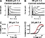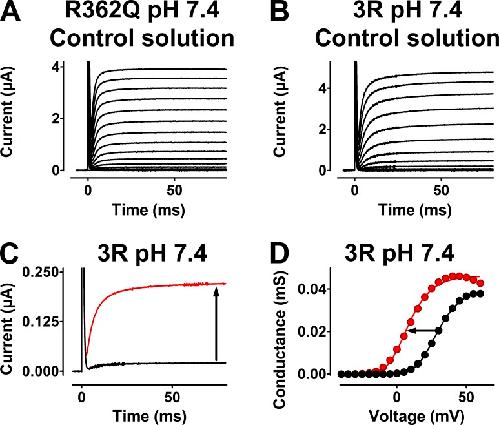 Figure 5. Characteristics of the 3R channel. (A and B) Current families for R362Q (A) and 3R channel (B) when stepping the membrane voltage from −80 mV to voltages between −80 and 40 mV (−60 and 60 mV for 3R channel) in 5-mV increments in control solution, pH 7.4, at a frequency of 0.2 Hz. (C) Representative current traces at pH 7.4 for 3R in control solution (black) and in 70 µM DHA (red) for a voltage corresponding to 10% of Gmax in control solution (i.e., 10 mV). The increment in current amplitude is >10-fold. (D) Representative G(V) curves. Same cell as in C (control, black symbols; DHA, red symbols). ΔG(V)DHA = −22.1 mV in this example.