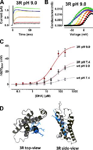 Figure 6. pH-dependent DHA sensitivity. (A) Representative current sweeps in control (black), 2.1 µM DHA (red), 7 µM DHA (orange), 21 µM DHA (yellow), 70 µM DHA (green), and 210 µM DHA (blue) at pH 9.0 and −15 mV (the voltage corresponding to 10% of Gmax in control solution minus 10 mV). Current amplitude is increased >40-fold at 70 µM DHA. (B) Representative G(V) curves. Same cell, color coding, and order as in A. The shifts are −4.9, −15.7, −26.7, −50.0, and −54.6 mV in this example. (C) Dose–response curve for R362Q (gray) and the 3R channel (red) at pH 7.4 (light colored) and at pH 9.0 (dark colored). Error bars indicate SEM (n = 4–15). (D) VSD of the open 3R Shaker structure (top view to the left and side view to the right) with arginines in S4 shown as blue sticks.