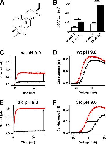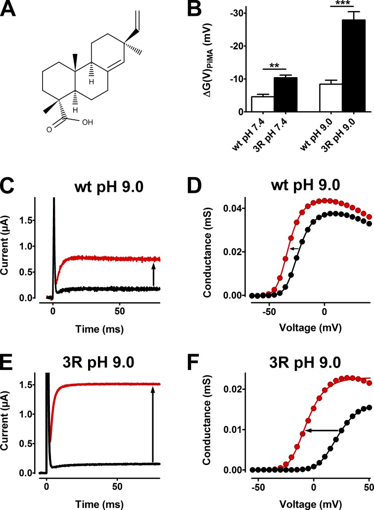 Figure 7. Drug sensitivity is increased for 3R. (A) Structure of PiMA, here in the uncharged form with the carboxylic acid group protonated. (B) G(V) shifts induced by 70 µM PiMA at pH 7.4 and 9.0 for WT and 3R. Mean ± SEM (n = 12, 6, 4, and 6; one-way ANOVA together with Bonferroni’s pairwise comparison test: **, P < 0.01; ***, P < 0.001). (C) Representative current traces at pH 9.0 for WT in control solution (black) and in 70 µM PiMA (red) for a voltage corresponding to 10% of Gmax in control solution (i.e., −35 mV). The current amplitude is increased fourfold. (D) Representative G(V) curves. Same cell as in C (control, black symbols; PiMA, red symbols). ΔG(V)PiMA = −9.0 mV in this example. (E) Representative current traces at pH 9.0 for 3R in control solution (black) and in 70 µM PiMA (red) for a voltage corresponding to 10% of Gmax in control solution (i.e., 5 mV). The current amplitude is increased >10 times. (F) Representative G(V) curves. Same cell as in F (control, black symbols; PiMA, red symbols). ΔG(V)PiMA = −28.5 mV in this example.