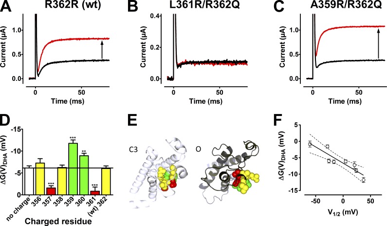 Figure 2. DHA sensitivity of the single arginine mutants. (A–C) Representative current traces for voltages corresponding to 10% of Gmax in control solution at pH 7.4. Black traces indicate control, and red traces indicate 70 µM DHA. The increments in current amplitudes are R362R (WT), 2.2 times (A); for L361R/R362Q, 0.9 times (B); and A359R/R362Q, 2.7 times (C). (D) DHA-induced G(V) shifts for the single-charge mutants (70 µM DHA at pH 7.4). The black line equals the DHA-induced shift for R362Q. Mean ± SEM (n = 8, 8, 6, 9, 10, 14, 9, and 9). DHA-induced shifts compared with R362Q (one-way ANOVA together with Dunnett’s multiple comparison test: **, P < 0.01; ***, P < 0.001). Green bars denote significantly larger DHA-induced shifts relative to the neutral 356–362 segment (open bar), the red bars denote significantly smaller shifts, and the yellow bars denote no significant differences. (E) Mutated residues are marked on one VSD of the Shaker K channel in states C3 and O. Same color coding as in D. (F) Correlations between the V1/2 values and the DHA-induced shifts for the channels described in D. Slope is significantly different from zero (Pearson correlation test, and linear regression: P < 0.01 for both). The symbols denote mean ± SEM, the continuous line is the linear regression, and the dashed lines denote the 95% confidence interval.
