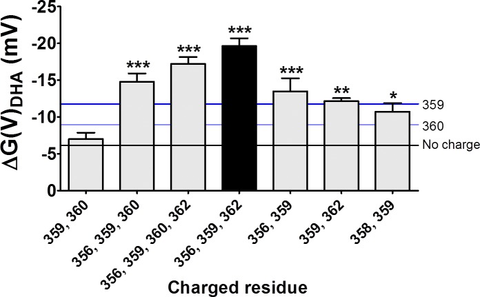 Figure 4. Combinations of arginines make channels more PUFA sensitive. DHA-induced shifts for multicharge channels (70 µM DHA at pH 7.4). Mean ± SEM (n = 9, 12, 10, 15, 11, 8, and 8). Horizontal lines denote shifts of R362Q (black), I360R/R362Q (light blue), and A359R/R362Q (dark blue). DHA-induced shifts compared with R362Q (one-way ANOVA together with Dunnett’s multiple comparison test: *, P < 0.05; **, P < 0.01; ***, P < 0.001).