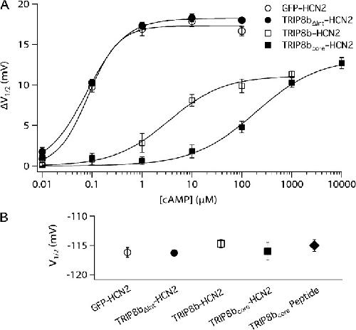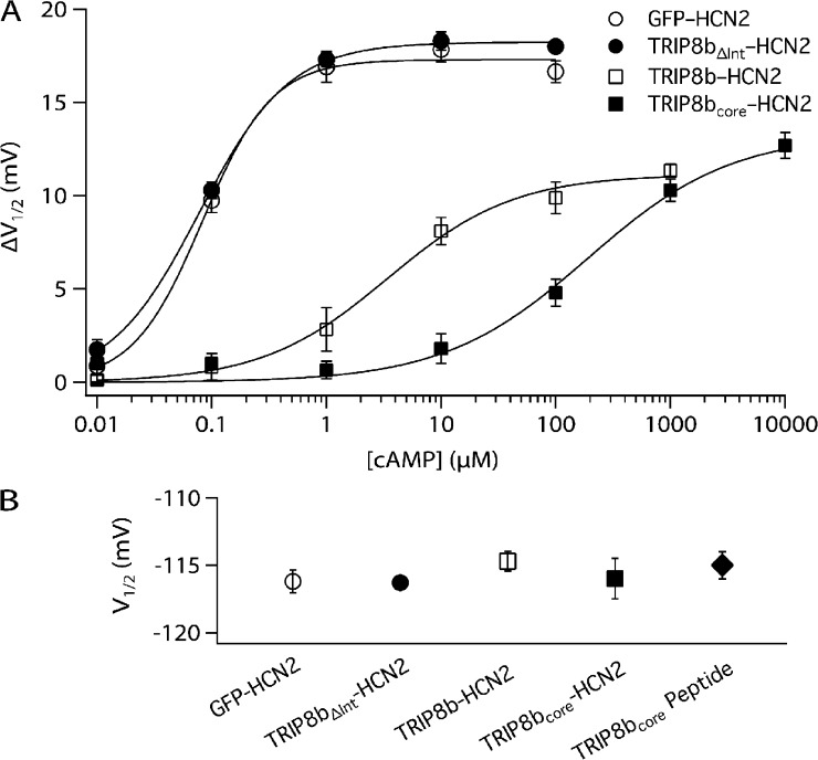 Figure 3. TRIP8b core domain is necessary to antagonize action of cAMP on HCN2. (A) ΔV1/2 as a function of [cAMP] for TRIP8bΔInt-HCN2 and TRIP8bcore-HCN2 channels in inside-out patches, compared with GFP-HCN2 and TRIP8b-HCN2 channels. Solid lines show fits of the Hill equation. Fits of the Hill equation yield TRIP8bΔInt-HCN2: ΔVmax = 18.2 mV, K1/2 = 0.08 µM, h = 1.11; and TRIP8bcore-HCN2: ΔVmax = 13.3 mV, K1/2 = 190 µM, h = 0.69. Note that TRIP8bΔInt, with internal deletion of 22 residues of the core domain, fails to alter cAMP dose–response relation. (B) V1/2 values of various indicated constructs in the absence of cAMP show no significant differences (P > 0.05, ANOVA). Error bars indicate SEM.