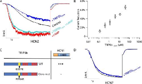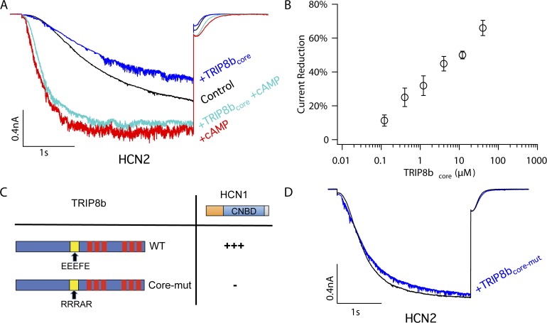 Figure 4. Direct application of TRIP8bcore polypeptide to inside-out patches suppresses HCN2 maximal current in the absence of cAMP. (A) Representative experiment showing effects of TRIP8bcore polypeptide on HCN2 currents in inside-out patches elicited by a hyperpolarization to −140 mV, either in the absence or presence of cAMP. The current recording protocol is described in Fig. 3. The internal bath solution contained control solution, 4 µM TRIP8bcore with no cAMP, 4 µM TRIP8bcore plus 100 µM cAMP, or 100 µM cAMP with no TRIP8b. (B) Dose–response curve for the percent reduction in current amplitude at extreme negative voltages as a function of TRIP8bcore polypeptide concentration (in the absence of cAMP). Error bars show SEM. (C) The binding activity of the HCN1 C-linker/CNBD (residues 390–611) with WT and mutant TRIP8b (constant region, exons 5–16) assessed using a yeast two-hybrid assay. For TRIP8b, the yellow square represents the conserved core region. In TRIP8bcore-mut, the WT EEEFE core residues are substituted by RRRAR. The red colors denote the TPR domains. Activity was detected by transactivation of a GFP reporter gene. “+++” indicates very strong fluorescence; “−” indicates no detectable fluorescence (see Santoro et al. [2011]). (D) Representative HCN2 currents before (black trace) and after (blue trace) the application of TRIP8bcore-mut polypeptide to inside-out patches. The current recording protocol is described in Fig. 3.