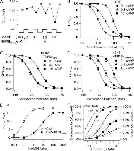 Figure 5. Effects of TRIP8bcore polypeptide on action of cAMP on HCN2 channel voltage gating. (A) Representative experiment showing V1/2 of HCN2 channels in inside-out patches with solutions containing the indicated [cAMP] in the absence or presence of 4 µM TRIP8bcore polypeptide. Open circles indicate V1/2 in the absence of both cAMP and TRIP8bcore; closed circles indicate V1/2 in the presence of 0.1 or 10 µM cAMP, with or without 4 µM TRIP8bcore polypeptide, as indicated. (B) Normalized G-V relationship for HCN2 channel tail currents in 0, 0.1, or 10 µM cAMP. (C) Normalized G-V relationship for HCN2 channel tail currents in the presence of 4 µM TRIP8bcore polypeptide plus 0, 0.1, or 10 µM cAMP. (D) Normalized G-V relationship for HCN2 tail currents in the presence of 4 µM TRIP8bcore-mut polypeptide plus 0, 0.1, or 10 µM cAMP. (E) Shift in V1/2 as a function of [cAMP] in the absence (open circles) or presence (closed circles) of 4 µM TRIP8bcore polypeptide. Solid lines show fits of the Hill equation, which yield HCN2: ΔVmax = 18.1 mV, K1/2 = 0.08 µM, h = 0.86; and HCN2 plus 4 µM TRIP8bcore: ΔVmax = 15.8 mV, K1/2 = 5.64 µM, h = 0.86. (F) Percent decrease in ΔV1/2 produced by the indicated concentrations of cAMP as a function of TRIP8bcore concentration (left ordinate). Fits of the Hill equation (solid lines) yield 0.1 µM cAMP: K1/2 = 0.22 µM, h = 1.35, percent maximal decrease in ΔV1/2 = 100%; 1 µM cAMP: K1/2 = 1.57 µM, h = 1.69, percent maximal decrease in ΔV1/2 = 97%; 10 µM cAMP: K1/2 = 2.34 µM, h = 1.19, percent maximal decrease in ΔV1/2 = 69%; and 100 µM cAMP: K1/2 = 3.96 µM, h = 0.74, percent maximal decrease in ΔV1/2 = 42%. The Hill fit to the TRIP8b dose–response curve for HCN2 maximal current reduction from Fig. 4 B is replicated here for comparison (red dashed line, right ordinate). Error bars indicate SEM.