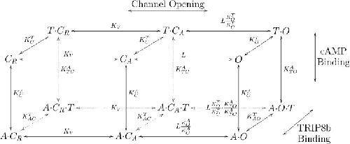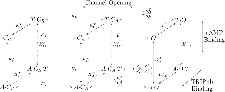 Figure 6. 12-state allosteric model for regulation of HCN2 channel opening by voltage, cAMP, and TRIP8b. The vertical and front-back transitions of the cubic scheme represent the cAMP and TRIP8b binding reactions to the channel, respectively. The two horizontal transitions are the voltage-dependent activation step reflecting voltage sensor movement, followed by a voltage-independent opening step. The front face of the cube is the six-state cyclic allosteric model that represents the effects of voltage and cAMP on channel opening in the absence of bound TRIP8b (Zhou and Siegelbaum, 2007); the top face is a six-state cyclic allosteric model that represents the actions of voltage and TRIP8b binding on channel opening in the absence of bound cAMP. TRIP8b and cAMP can both bind to the channel at the same time, as represented by the back and bottom faces of the cube. Definition of states and ligands: CR, unliganded closed channel with voltage sensor in the resting state; CA, unliganded closed channel with voltage sensor in the activated state; O, unliganded channel in the open state; A, cAMP; T, TRIP8b. Definition of parameters: KV, equilibrium constant for transition of closed channel transition between resting state and activated state; L, intrinsic equilibrium constant for channel opening; KCA and KOA, dissociation equilibrium constants for cAMP binding to closed and open states, respectively; KCT and KOT, dissociation equilibrium constants of TRIP8b binding to channel in closed and open states, respectively; KTCA and KTOA, dissociation equilibrium constants for cAMP binding to TRIP8b-bound channels in closed and open states, respectively; KACT and KAOT, dissociation equilibrium constants for TRIP8b binding to cAMP-bound channels in closed and open states, respectively.