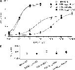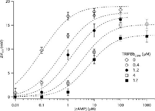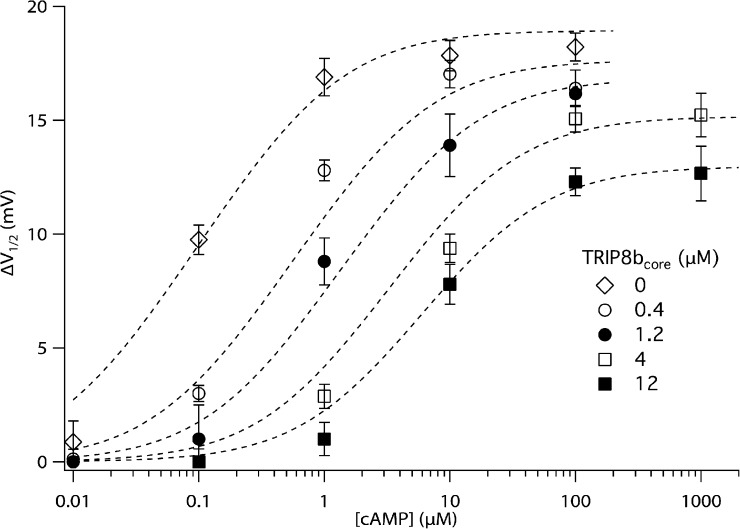 Figure 7. ΔV1/2 as a function of [cAMP] and [TRIP8bcore] polypeptide, fitted by the 12-state allosteric model. The TRIP8bcore polypeptide concentrations are indicated. The parameters of the front face of the model (corresponding to the six-state cyclic model) are adopted from Zhou and Siegelbaum (2007): L = 0.43, s = 4.4, KCA = 0.844 µM, KOA = 0.008 µM. The best fit of the model yields the following values for the other parameters: KCT = 0.089 ± 0.027 µM, KOT = 0.064 ± 0.010 µM, KTCA = 33.58 ± 8.18 µM, KTOA = 3.53 ± 1.33 µM. KACT and KAOT are then derived from the other parameters: KACT = KTCA·KCT/KCA = 3.54 µM and KAOT = KTOA·KOT/KOA = 28.24 µM. Error bars show SEM. See supplemental text for further details.
