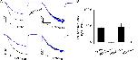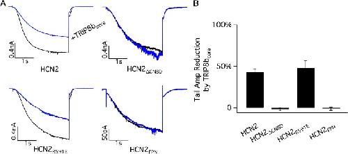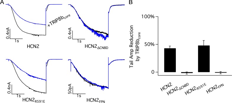 Figure 8. Importance of C-terminal regions of HCN2 for the ability of TRIP8b to reduce maximal current. (A) Representative currents through HCN2 WT and mutant channels before (black traces) and after (blue traces) the application of 4 µM TRIP8bcore polypeptide to inside-out patches (no cAMP present). HCN2ΔCNBD, truncation after residue V526 removing entire CNBD and all downstream residues; HCN2R591E, point mutation of conserved arginine in CNBD required for high-affinity cAMP binding; HCN2FPN, triple point mutation substituting FPN sequence for residues QEK in A′ helix of C-linker (residues 450–452 in HCN2). The recording protocol is described in Fig. 2. (B) Percent reduction in maximal tail current amplitude for HCN2 WT and mutant channels in response to 4 µM TRIP8bcore polypeptide. Error bars indicate SEM. Mean percent reductions ± SEM are as follows: HCN2, 43 ± 4% (n = 9); HCN2ΔCNBD, −1.6 ± 2% (n = 3); HCN2R591E, 48 ± 9% (n = 3); and HCN2FPN, −1 ± 2% (n = 3).