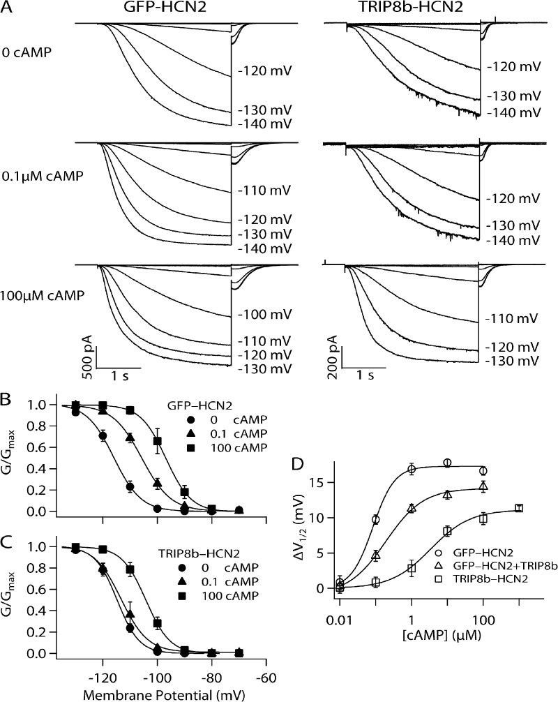 Figure 1. Effect of fusion of TRIP8b to HCN2 on relationship between [cAMP] and voltage dependence of channel gating. (A) Currents elicited by hyperpolarizing voltage steps in inside-out patches from oocytes expressing TRIP8b-HCN2 fusion channels or GFP-HCN2 channels in 0, 0.1, or 100 µM [cAMP]. The membrane was held at −40 mV for 0.5 s and then stepped for 3 s to test potentials from −70 to −140 mV in 10-mV decrements. (B and C) Normalized tail current G-V relationship for GFP-HCN2 (B) or TRIP8b-HCN2 (C) channels in the presence of 0, 0.1, or 100 µM [cAMP]. Fits of Boltzmann relation yield the following values for V1/2 and slope with different [cAMP]. GFP-HCN2 0 cAMP: V1/2 = −116.0 mV, s = 4.98; 0.1 cAMP: V1/2 = −105.7 mV, s = 5.33; and 100 cAMP: V1/2 = −96.9 mV, s = 4.65. TRIP8b-HCN2 0 cAMP: V1/2 = −114.8mV, s = 4.05; 0.1 cAMP: V1/2 = −113.3 mV, s = 4.91; and 100 cAMP: V1/2 = −104.2 mV, s = 4.42. (D) ΔV1/2 as a function of [cAMP] for GFP-HCN2, GFP-HCN2 + TRIP8b expressed as independent proteins, and TRIP8b-HCN2 fusion channels in inside-out patches. Solid lines show fits of Hill equation. Fits of the Hill equation yield GFP-HCN2: ΔVmax = 17.3 mV, K1/2 = 0.08 µM, h = 1.43; GFP-HCN2 + TRIP8b: ΔVmax = 14.2 mV, K1/2 = 0.19 µM, h = 0.83; and TRIP8b-HCN2: ΔVmax = 11.1 mV, K1/2 = 3.42 µM, h = 0.79. Error bars indicate SEM.