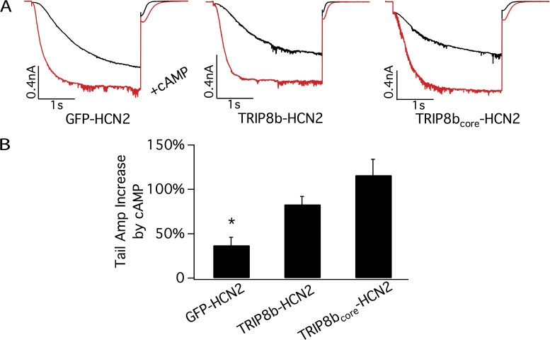 Figure 2. cAMP causes a larger increase in maximal current with TRIP8b-HCN2 and TRIP8bcore-HCN2 channels than with GFP-HCN2 channels. The membrane was held at −40 mV and then hyperpolarized to −140 mV with a 3-s test pulse, followed by a depolarizing pulse to −40 mV to measure the tail current. (A) Representative currents for GFP-HCN2, TRIP8b-HCN2, and TRIP8bcore-HCN2 channels before (black traces) and after (red traces) application of saturating concentrations of cAMP (100 µM for GFP-HCN2 and 1 mM for the other two channels) to inside-out patches. (B) Percent increase in maximal tail current amplitude in response to cAMP for GFP-HCN2, TRIP8b-HCN2, and TRIP8bcore-HCN2; error bars indicate SEM. Mean percent increases in maximal current ± SEM are as follows: GFP-HCN2: 37 ± 9% (n = 9); TRIP8b-HCN2: 83 ± 9% (n = 10); and TRIP8bcore-HCN2: 116 ± 18% (n = 9). Current amplitude increase with GFP-HCN2 by cAMP is significantly less than that seen with TRIP8b-HCN2 and TRIP8bcore-HCN2 (*, P < 0.05, ANOVA). There is no significant difference in current increase between the latter two constructs (P > 0.05, t test).