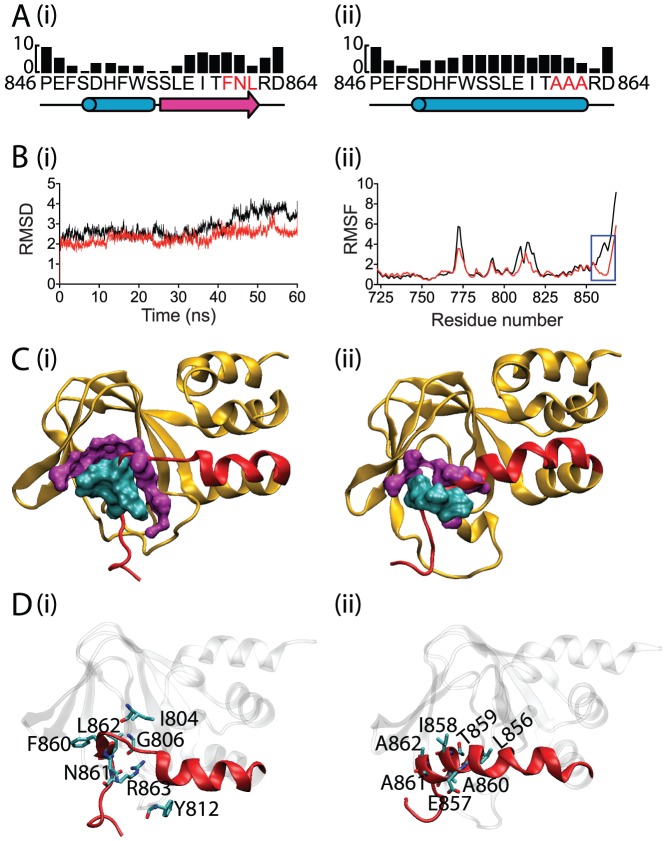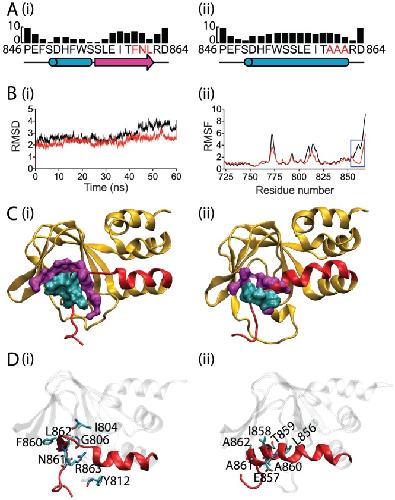 Figure 5. Secondary structure prediction and MD simulations of cNBH domain.Sequence prediction of the cNBH domain around the β9-strand for (A) WT (i) and AAA mutant (ii). (B) RMSD (i) and RMSF (ii) of WT (red) and AAA mutant (black) from the 60 ns of MD simulations. The blue box highlights the most significant difference between WT and AAA mutant in the backbone fluctuation. (C) The structures that have the lowest structural fluctuation to the centroid structure in the most populated cluster from the last 10 ns for WT (i) and AAA mutant (ii). Residues involved in hydrophobic interactions, defined by being within 4 Å of residues 860, 861 and 862 (cyan), are highlighted in magenta for WT (i) and AAA mutant (ii). There are reduced hydrophobic interactions in the AAA mutant. (D) Summary of residues that participate in hydrogen bonds with residues 860, 861 and 862 in WT (i) and the AAA mutant (ii) that are present for more than 5% of the 60 ns of MD simulation (see Table 1 for details).