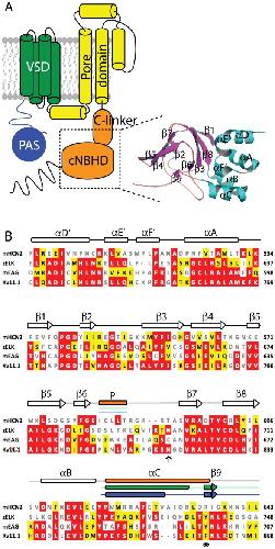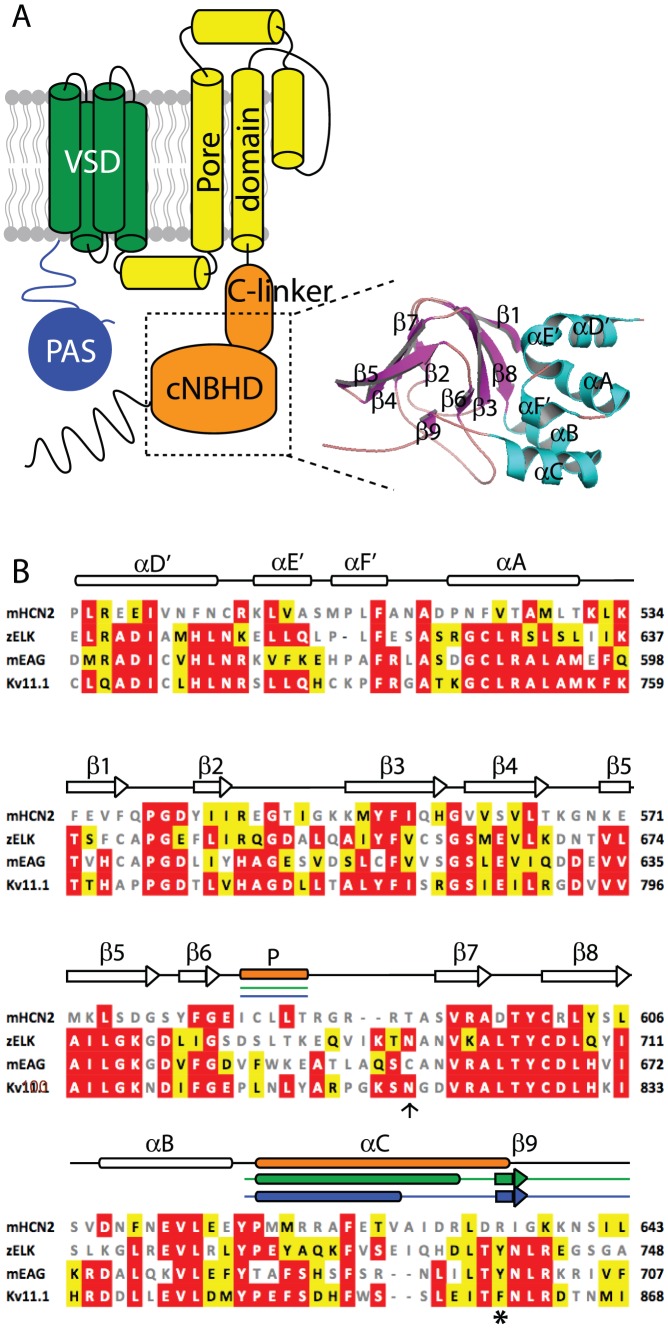 Figure 1. Topology of Kv11.1 channels and sequence analysis of cNBH domains.(A) Topology of Kv11.1 channel showing the intracellular N-terminal PAS domain (blue), transmembrane voltage sensing domain (green), pore domain (yellow) and intracellular C-terminal C-linker and cNBH domains (orange). Inset shows the homology model of the cNBH domain of Kv11.1 generated based on the mEAG crystal structure [13]. (B) Sequence alignment of mHCN2, zELK, mEAG and human Kv11.1 extracted from a Clustalw alignment of the entire family of KCNHx/HCNx/CNGx ion channels. Sequences shown correspond to the dotted box region shown in panel A. Sequence similarity to the Kv11.1 are marked by white text/red box (identical) and black text/yellow box (similar). Non-conserved sequences are in grey. Clear rods and arrows represent the consensus α-helices and β-strands while filled rods and arrows indicate the differences with orange, green and blue representing mHCN2, zELK and mEAG, respectively. The hydrogen bond between asparagine (arrow) and tyrosine (asterisk) in zELK is not observed in the others.