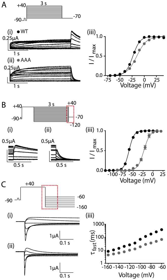 Figure 2. Gating Phenotype of AAA mutant.(A) Family of current traces recorded during a 3 s isochronal activation protocol for (i) WT and (ii) AAA mutant channels. (iii) Isochronal activation curves for WT (filled black circle) and AAA mutant (filled grey circle). The mean V0.5 of isochronal activation for the AAA mutant and WT were −15.1±1.0 mV (n = 4) and −23.1±0.4 mV (n = 4), respectively; see Table S1 in File S1. (B) Families of −70 mV tail current traces recorded during a 3 s isochronal deactivation protocol for (i) WT and (ii) AAA mutant. The dotted box in the voltage protocol indicates the portion of the traces shown in the current recordings. (iii) Isochronal deactivation curves for WT (filled black circle) and AAA mutant (filled grey circle). Data are presented as mean ± SEM for n = 4 experiments. The mean V0.5 of isochronal deactivation for the AAA mutant and WT were −23.4±1.1 mV (n = 4) and −61.3±0.8 mV (n = 4), respectively. (C) Typical family of current traces recorded between −60 to −160 mV at 20 mV intervals, corresponding to the dotted box in the voltage protocol, used to measure rates of deactivation for (i) WT and (ii) AAA mutant. (iii) Summary of the rates of deactivation for AAA mutant (grey) and WT (black). Data shown as mean ± SEM (n = 4), error bars are within the symbols.