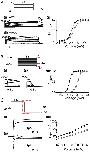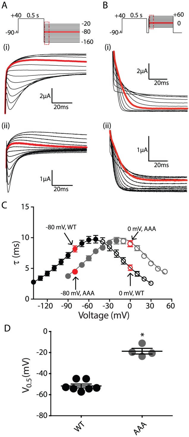 Figure 3. Inactivation phenotype of AAA mutant.(A) Current traces correspond to dotted box in the voltage protocol used to measure the recovery of inactivation for (i) WT and (ii) AAA mutant. Current traces recorded at −80 mV are highlighted to show the faster recovery of inactivation for AAA mutant. (B) Current traces correspond to dotted box in the voltage protocol used to measure the onset of inactivation for (i) WT and (ii) AAA mutant. Current traces recorded at 0 mV are highlighted to show the slower onset of inactivation for the AAA mutant. (C) Summary of rates of recovery and onset of inactivation plotted against voltages between −130 and +50 mV. The data points for −80 and 0 mV are indicated by the arrows. The mid-point of steady-state inactivation for the AAA mutant (grey) is right-shifted by ∼33 mV from WT (black). (D) V0.5 of steady-state inactivation for WT (−51.7±1.9 mV, n = 7; filled black circle) and AAA mutant (−18.7±2.7 mV, n = 4; filled gray circle) (*indicates p<0.05 versus WT, ANOVA). Data are presented as mean ± SEM.