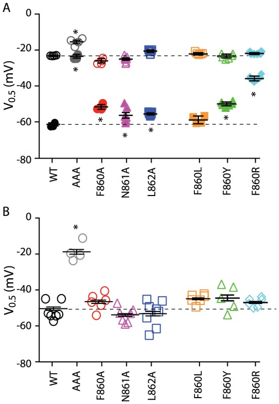 Figure 4. Summary data for individual β9-strand mutants.(A) Scatter plot of the V0.5 values for the 3 s isochronal activation (open symbols) and 3 s isochronal deactivation (closed symbols) for WT (black), AAA (grey), F860A (red), N861A (magenta), L862A (blue), F860L (orange), F860Y (green) and F860R (cyan). (B) Scatter plot of the V0.5 values for the steady-state inactivation (open symbols) for WT, AAA, F860A, N861A, L862A, F860L, F860Y and F860R (same colour scheme as in panel A). In all panels, the mean and SEM are indicated by horizontal bars and asterisks indicate values that are statistically significantly different to WT (P<0.05, ANOVA). The dashed horizontal lines indicate mean values for WT. The values for all mutants are summarized in Table S1 in File S1.
