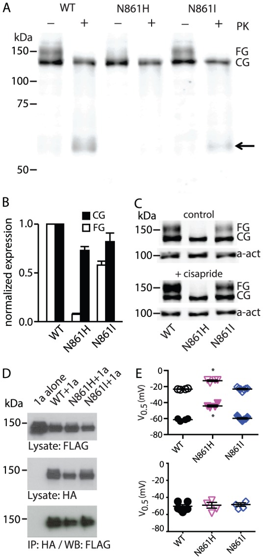 Figure 6. Trafficking assay of LQT2 mutants located within β9-strand.(A) Typical western blot of WT, N861I and N861H mutant channels. WT shows two bands at ∼155 kDa and ∼135 kDa. The ∼155 kDa band disappears following digestion of surface proteins with proteinase K. The N861H mutant shows only a single ∼135 kDa band. N861I contains both ∼155 kDa and ∼135 kDa bands. Arrow indicates degradation band after proteinase K digestion. (B) Normalized expression levels of N861H and N861I relative to WT for the fully glycosylated (∼155 kDa band) and core-glycosylated (∼135 kDa band) proteins. (C) The partially trafficking defective N861I can be rescued by incubation with cisparide whereas N861H was not rescued by cisapride. (D) Co-imunpreciptation of HA-tagged mutant subunits with Flag-tagged WT subunits. (E) Top panel: Summary of 3 s isochronal activation V0.5 (open symbols) and 3 s isochronal deactivation V0.5 (closed symbols) for WT (black), N861H (magenta) and N861I (blue). Asterisks indicate P<0.05 (ANOVA) compared to WT. Bottom panel: Summary of the V0.5 of steady-state inactivation for WT, N861H and N861I (same colours as in top panel). Mean data for all mutants are summarized in Table S1 in File S1.