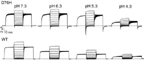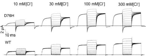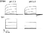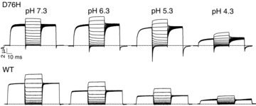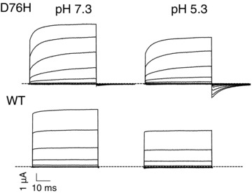 Figure 2. pH dependence of D76H and WTRepresentative current recordings for D76H (upper traces) and WT ClC-5 (lower traces) at pH 7.3 and 5.3. Voltages of the test pulse ranged from 120 to –80 mV. Here and in all figures with current traces, the dashed line represents the zero current level.