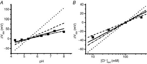 Figure 7. Dependence of the inward tail currents on [Cl−]intA, representative inward tail currents at the indicated [Cl−]int (104 and 21 mm). [Cl−]ext is 110 mm and pHext is 5.8. Currents shown are the average of five traces. B, mean values of the reversal potential at [Cl−]int = 104 (n= 5) and 21 mm (n= 4). The full, dashed-dotted, dashed and dotted lines represent the theoretical expectation for the changes in the reversal potential for transporters with a 2 : 1, 3 : 1 or 1 : 1 Cl−/H+ stoichiometry or a pure proton conductance, respectively, derived from eqn (3). Error bars are smaller than symbols.