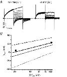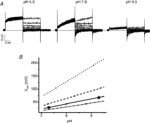 Figure 6. Dependence of the inward tail currents on pHintA, representative inward tail currents at the indicated pHint values (5.3, 7.3, 9.3) from three different oocytes. [Cl−]ext is 110 mm and pHext is 5.8. Currents shown are the average of five traces. B, mean values of the reversal potential at pHint 7.3 (n= 5) and 9.3 (n= 3). The full, dashed-dotted, dashed and dotted lines represent the theoretical expectation for the changes in the reversal potential for transporters with a 2 : 1, 3 : 1 or 1 : 1 Cl−/H+ stoichiometry or a pure proton conductance, respectively, derived from eqn (3).