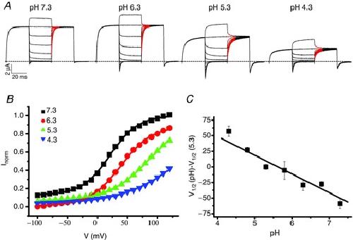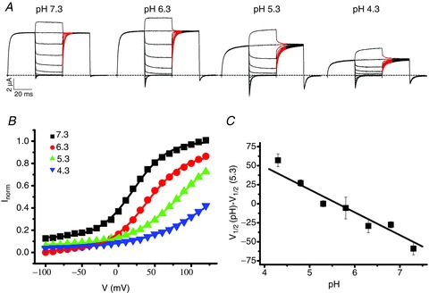 Figure 8. Voltage dependence of gating of D76H as a function of pHextA, representative current traces at the indicated pHext from one oocyte. Red lines represent the mono-exponential fit of the tail currents elicited by a post-pulse to 100 mV. The amplitude of the tail currents at the onset of the post-pulse was extrapolated from the fit. These values were normalized with the parameter Imax derived from the fit with eqn (1) to obtain the current–voltage (I–V) relationships. B, I–V relationships for the oocyte shown in A. Full lines are the fit of the data with a Boltzmann function (eqn (1)) providing estimates for V1/2 and z of 21, 39, 89, 141 mV and 1.1, 1.0, 0.8 and 0.5, respectively, for pH 7.3, 6.3, 5.3 and 4.3. C. mean values of the difference between V1/2 calculated at pH 4.3 (n= 6), 6.3 (n= 5), 7.3 (n= 7) and that calculated at pH 5.3 (n= 10) as a function of pHext. The full line represents the fit of the data with a linear function with a slope of 30.7 ± 6.4 per pH unit.