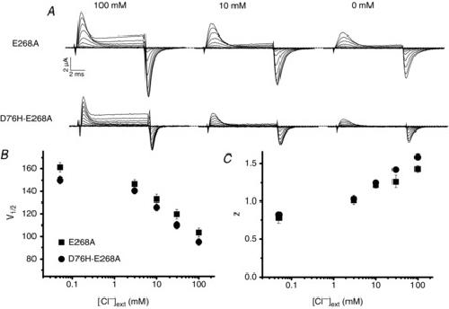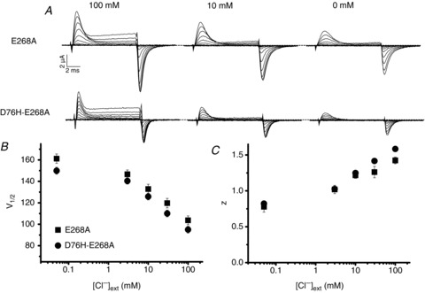 Figure 9. Comparison of the transient currents of E268A and D76H–E268A at different [Cl−]extA, representative current recordings from two oocytes, one expressing E268A (upper panel) and one expressing D76H–E268A (lower panel) at the indicated [Cl−]ext. B and C, average values for V1/2 and z, respectively, obtained from the Boltzmann fit of the Q–V relationship for [Cl−]ext of 0 mm (a contaminating concentration of 80 μm was assumed, see Zifarelli et al. 2012) (n= 6), 3 mm (n= 7), 10 mm (n= 6), 30 mm (n= 7) and 100 mm (n= 6) (eqn (3) and Supplemental material).