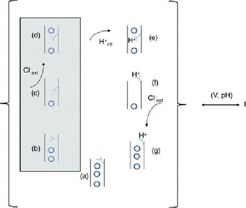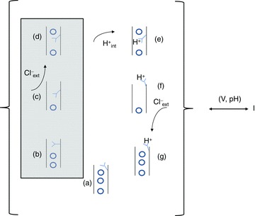 Figure 10. Schematic model of the transport cycle of ClC-5 including a gating mechanismThe hypothetical model is based on the transport cycle suggested for ClC-Cm by Feng et al. (2010) with the addition of state (c). The model is not intended to provide a realistic description of the ClC-5 transport cycle, but rather to guide a mechanistic interpretation of the results. Circles represent Cl− ions; the shaded box represents the branch of the transport cycle that is accessible to the E268A mutant. From any of the states composing the transport cycle, indicated collectively by a brace, ClC-5 can transition to the inactive state I in which it is not able to transport. Forward and backward transitions to state I are voltage and pH dependent. In state (a), the side chain of E211 is unprotonated and the transporter has all the binding sites occupied by Cl− ions. In state (b), the side chain of E211 moves to occupy Sext and one Cl− ion moves intracellularly. In state (c), the side chain of E211 moves to occupy Scen and this is associated with the transport of another Cl− ion, whereas Sext is transiently empty but binds an extracellular Cl− ion in state (d). From this conformation E211 can be protonated by an intracellular proton (state e) and can move outwardly (state f), giving way to Cl− binding from the extracellular space (state g).