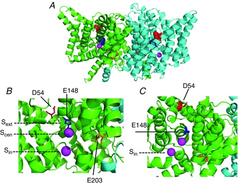 Figure 1. Location of the residue D76 mapped on the structure of ClC-ec1 (PDB entry: 1OTS)A, dimeric structure of ClC-ec1 viewed from the membrane plane (extracellular side above and cytoplasmic side below). The two subunits are shown in green and cyan. Residue E148 (corresponding to E211 in ClC-5) is coloured in blue, D54 (corresponding to D76 of ClC-5) is shown in red and E203 (corresponding to E268 of ClC-5) in orange. Cl− anions bound to Scen and Sint are shown in magenta. B, expanded representation of the anion permeation pathway for one of the subunits. The position of the three binding sites, Sext, Scen and Sint, is also indicated by horizontal dashed lines. C, same representation as in B with a top view perpendicular to the membrane. In B and C, some transmembrane helices were removed for clarity.