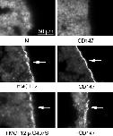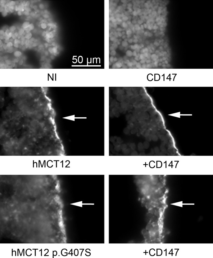 Immunofluorescence images. Membrane localization of human MCT12 (hMCT12) in Xenopus laevis oocytes injected with SLC16A12 cRNA. Noninjected oocytes and those injected with the chaperone CD147 alone served as controls (top row). Membrane localized signals (arrow) were detected only in oocytes injected with MCT12, irrespective of the presence of chaperone CD147.