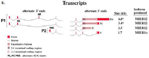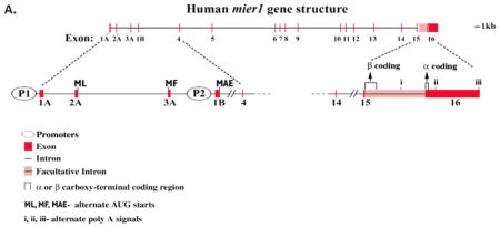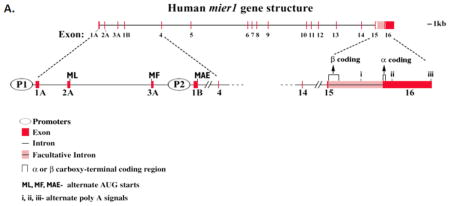 Genomic organization of the human mi-er1 gene and characterization of alternatively spliced isoforms: regulated use of a facultative intron determines subcellular localization.