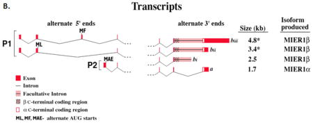 B. Schematic illustrating the variant 5′ and 3′ ends of human MIER1 transcriptsAlternate 5′ ends are generated from differential promoter usage (P1 or P2) or alternate inclusion of exon 3A. This leads to three alternate starts of translation, indicated as ML-, MF- and MAE-, and produces three distinct amino termini. The four variant 3′ ends, a, bi, bii and biii, produced by alternative splicing or alternate PAS usage, result in transcripts readily distinguished by size (1.7 kb, 2.5 kb, 3.4 kb and 4.8 kb, respectively) on a Northern blot. It should be noted that three of the variant 3′ ends, bi, bii and biii encode the same protein sequence and differ only in their untranslated region. * indicates beta encoding transcript that contains the alpha exon in its 3′UTR. The locations of the alpha and beta carboxy-terminal coding regions and PAS i, ii and iii are indicated. The combination of three possible 5′ ends with four possible 3′ ends gives rise to 12 distinct transcripts, but only 6 distinct protein isoforms. In most adult tissues, the most abundant transcript is 4.8 kb. Additional transcripts have been reported in Ensembl.
