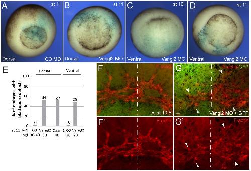 Fig. S2. Inhibition of blastopore lip formation in Vangl2-depleted embryos. (A-E) Early embryos were injected with Vangl2 MO or control MO either dorsally or ventrally as indicated. LacZ RNA (150 pg) has been coinjected a lineage tracer. Vegetal views of stage 11 embryos are shown. E, Quantitation of the experiments shown in A-D. (F, G) En face view of the dorsal lip in stage 10+ embryos. Vangl2 was depleted by a unilateral injection of control or Vangl2 MO (30 ng each). F-actin staining in control (F) and Vangl2-depleted (G) blastopore cells. Arrow points to reduced apical F-actin in Vangl2-depleted cells (marked by GFP, green). Animal pole is at the top. Scale bar in F (also applies to G) is 10 μm. Dashed line indicates the midline. Arrowheads point to F-actin-enriched areas, which are reduced by Vangl2 depletion. |