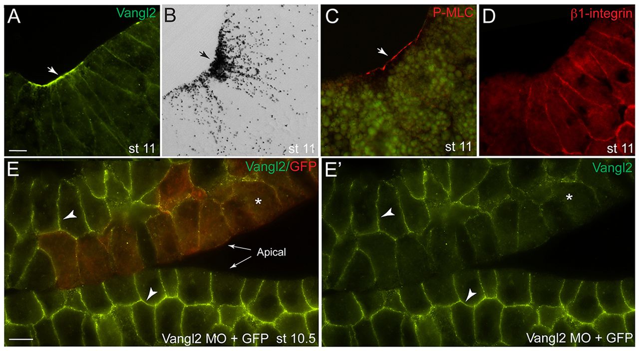 Fig. 1. Subcellular distribution of Vangl2 at the blastopore lip. (A-D) Parasagittal sections of stage (st) 11 embryos showing the blastopore area (arrows). (A) Immunohistochemical staining demonstrating apical and basolateral localization of endogenous Vangl2. (B) Bright-field view of a similar embryo section shows extensive pigmentation in the constricting blastopore cells. (C) Staining with antibodies against pMLC. (D) Basolateral localization of β1-integrin in bottle cells. (E,Eâ²) Subcellular distribution of Vangl2 in the superficial and the inner ectoderm cells. (E) Mosaic distribution of Vangl2 MO with GFP RNA as a lineage tracer (red) confirms Vangl2 antibody specificity. (Eâ²) Green channel only. Arrowheads point to Vangl2 staining in E,Eâ²; asterisks indicate lack of staining. Two embryo sections are shown side-by-side to illustrate Vangl2 depletion. Scale bars: 20â µm. |