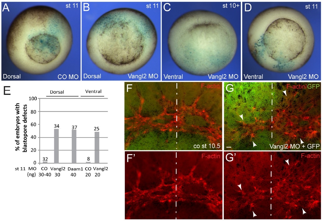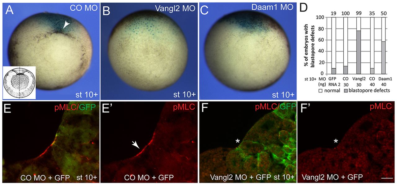 Fig. 2. Vangl2 and Daam1 are required for blastopore formation. (A-D) Blastopore defects in embryos depleted of Vangl2 and Daam1. Embryos were injected with control (CO) MO, Vangl2 MO or Daam1 MO, as indicated, and lacZ RNA (150â pg) as a lineage tracer. The vegetal view is shown. Dorsal is to the top. A schematic of a gastrula embryo is shown in the inset in A. (A-C) Blastopore formation (arrowhead) is inhibited in stage (st) 10+ embryos by Vangl2 MO or Daam1 MO. (D) Quantification of the effect. (E,Eâ²) Myosin II light chain (MLC) phosphorylation at the blastopore lip (arrow) in control embryos. (F,Fâ²) Vangl2 MO inhibits Myosin II activation (asterisk) in apically constricting cells. Scale bar: 20 µm. |
