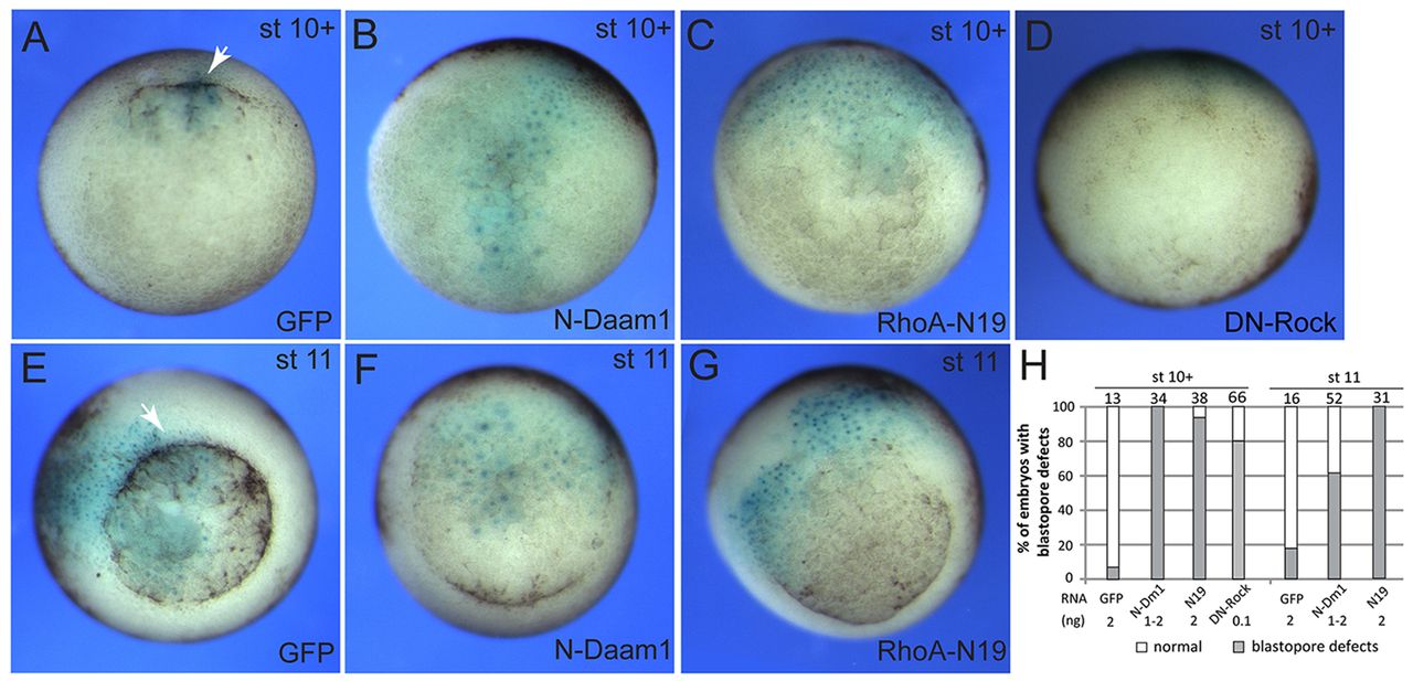 Fig. 3. Roles of downstream PCP components in bottle cell formation. (A-D) Early blastopore defects in embryos expressing dominant interfering constructs for PCP and Rock pathway components. Embryos were injected with GFP, N-Daam1 or RhoA-N19 RNAs (2â ng each) or DN-Rock RNA (0.1â ng), together with lacZ RNA (0.15â ng) as lineage tracer. Vegetal view of stage (st) 10+ embryos is shown. Dorsal is to the top. (E-G) Embryos expressing N-Daam1 and RhoA-N19 display delayed blastopore closure at stage 11. Arrows in A and E indicate blastopore lip in control GFP-expressing embryos. (H) Quantification of the effect. N-Dm1, N-Daam1; N19, RhoA-N19. |